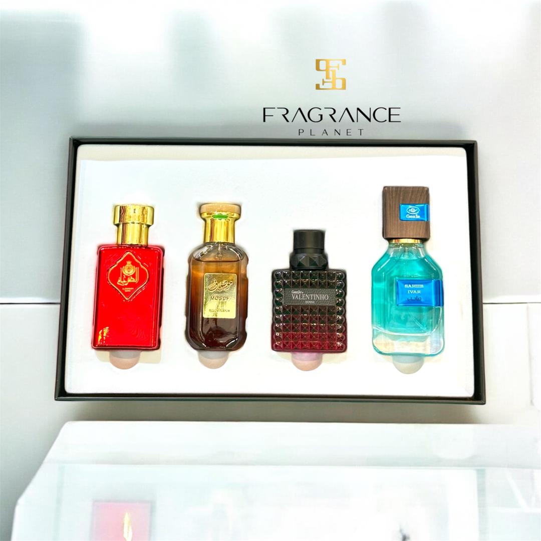 A versatile Genie perfume set featuring four 30 ml fragrances — ideal for mix-and-match wear or gift giving. Offers a variety of scent profiles in one stylish, compact collection.
