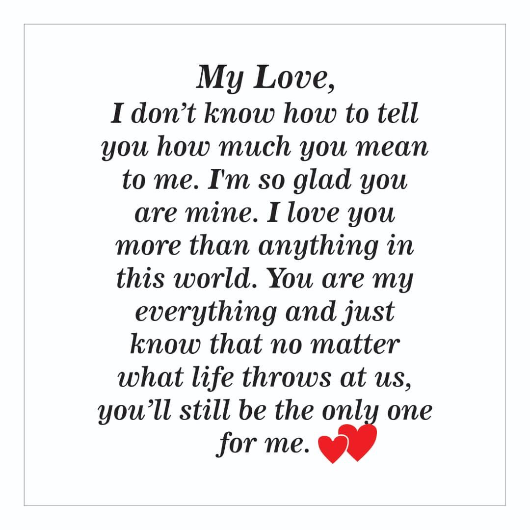 MY LOVE, I DON’T KNOW HOW TELL YOU HOW MUCH YOU MEAN TO ME. I’M SO GLAD YOU ARE MINE. I LOVE YOU MORE THAN ANYTHING IN THIS WORLD. YOU ARE MY EVERYTHING, AND JUST KNOW THAT NO MATTER WHAT LIFE THROWS AT US, YOU’LL STILL BE THE ONLY ONE FOR ME. 💕